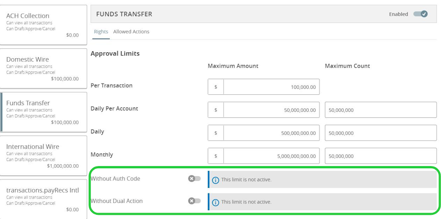 • Auth Code & Dual Action must be disabled for Funds Transfer.