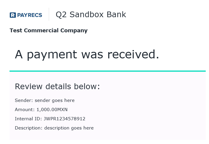 • Subject:“<sendingCompanyName> is paying you for "<Invoice #>" pid:<PaymentId>”