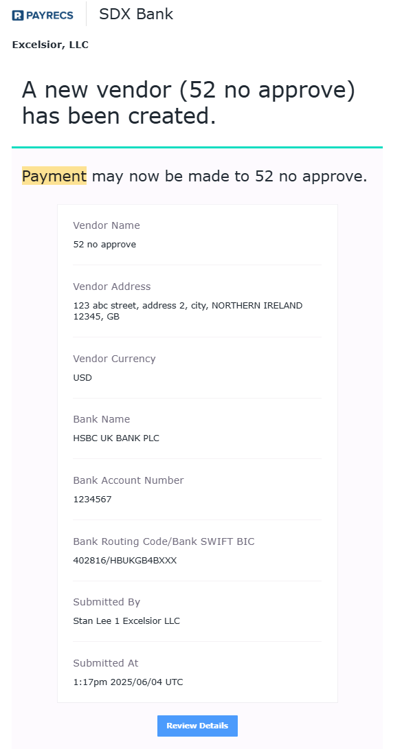 • Subject: Approval Needed for payment to <Recipient Name> - Invoice <Invoice #> (<PaymentId>)