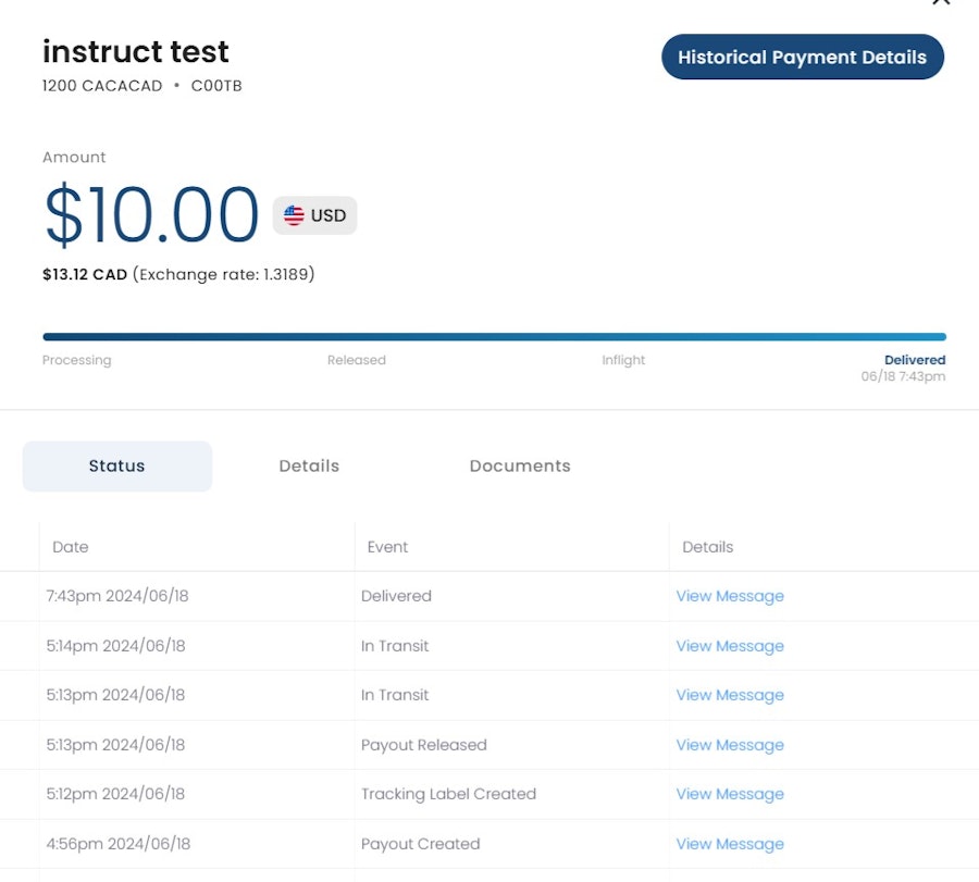 While the payments hub reflects similar states as the end user display, there are more details available. Generally this includes all of the details that the tracking provides, as seen here