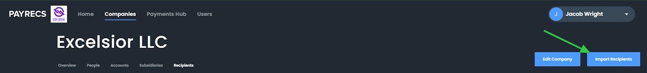 There are 2 opportunities to import recipients. When you're initially onboarding the company there will be a check box to Import Recipients on the last page of the onboarding process. Check the box to import recipients when you submit the company.