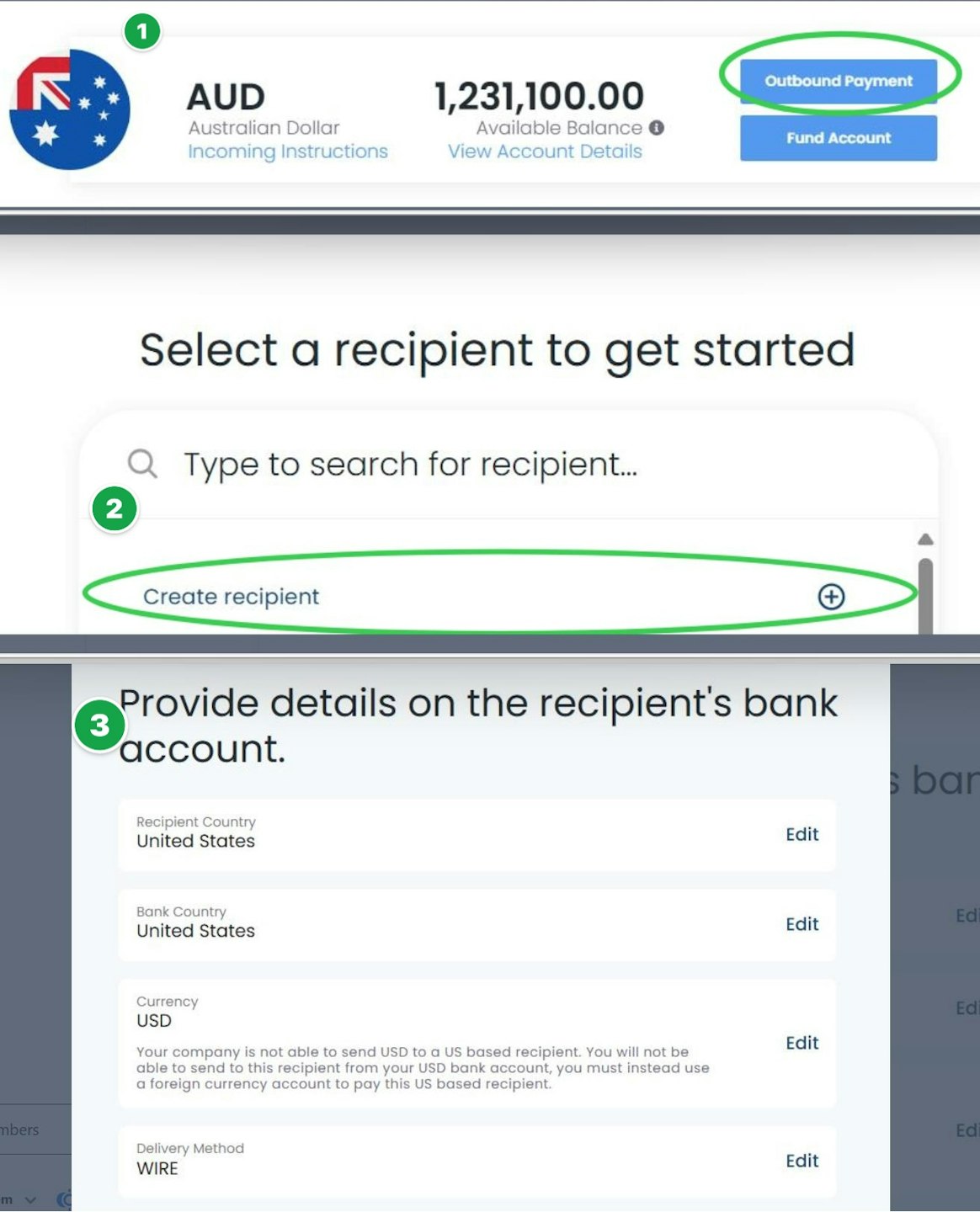 Ensure the Bank & Recipient country are US. Currency is USD
