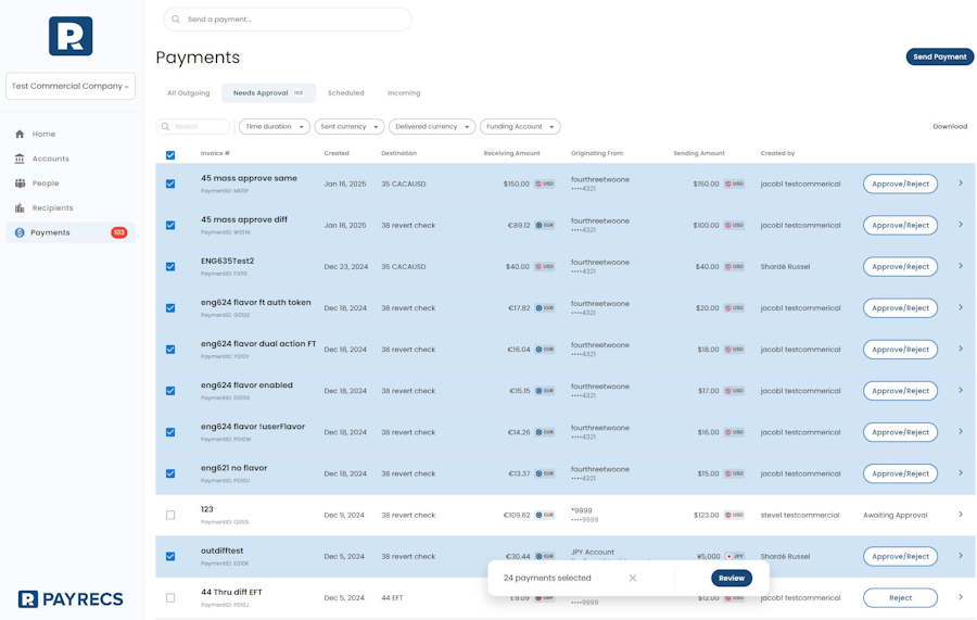This will display check boxes next to all of the payments available for approval. Select the desired payments and select the "Review" button at the bottom of the display to continue with the approval process