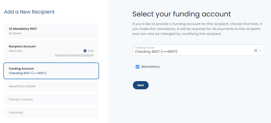 2. User A creates a Recipient with 9007 as the mandatory funding account