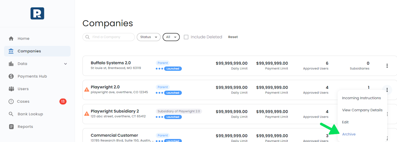 To prevent access AND remove the Company from the PayRecs portal. Select the 3 dots next to the desired company and mark it as "Archive". This will soft delete the company and remove it from the companies list AND prevent SSO access.